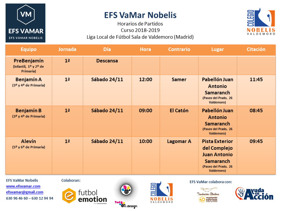 Los horarios de los partidos de la EFS VaMar Nobelis serán los siguientes:
